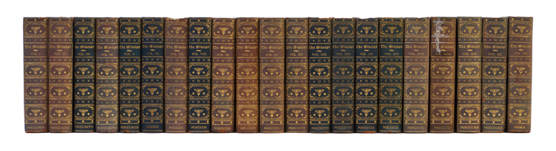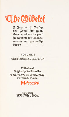 The Bibelot. A Reprint of Poetry and Prose for Book Lovers, chosen in part from scarce editions and sources not generally known. New York: Wm. H. Wise, 1895.21 vols. Small 8vo, 3/4 blue leather over cloth, gilt-lettered and -decorated spines, t.e.g. Spines uniformly darkened; edgewear.