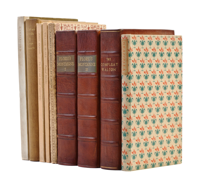Montaigne's Essayes. Translated by John Florio. Edited by J.I.M. Steward. London: Nonesuch Press, 1921.2 vols. 8vo, publisher's full calf. Limited. Together with seven other volumes published by the Nonesuch Press, all limited editions, comprising: The Compleat Angler. By Isaak Walton. [The First and Second Anniversaries]. By John Donne. Poetical Sketches. By William Blake. Anacreon. By Abraham Cowley. Ulick and Soracha. By George Moore. Paradoxes and Problems. By John Donne. Graziella. By A. de LaMartine. (9 total)