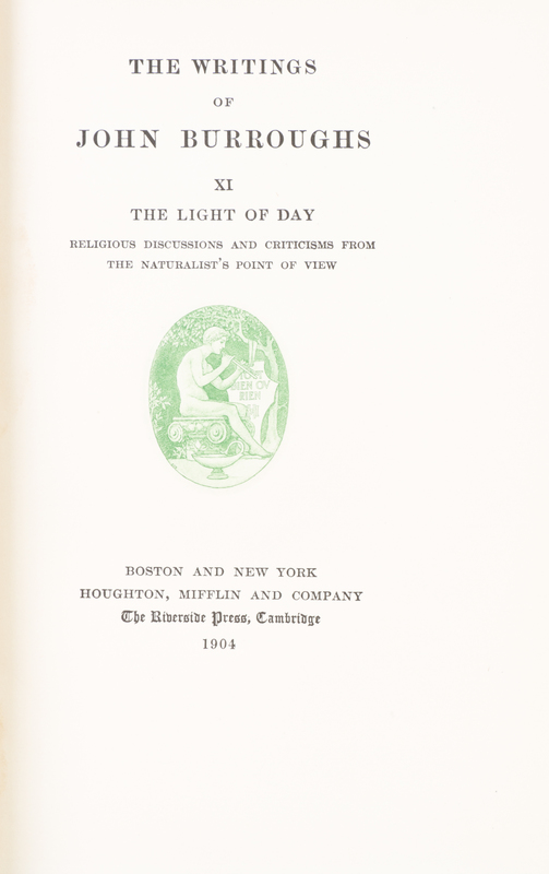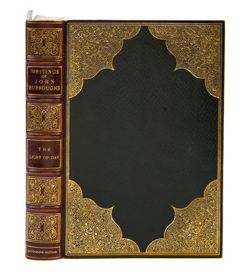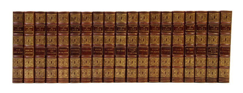 The Writings of John Burroughs. Cambridge, MA: Houghton Mifflin; The Riverside Press, 1904.19 vols. 8vo, crushed green morocco with gilt-arabesque design to corners of covers, gilt-tooled and -lettered spines, elaborately gilt inner-dentelles and gilt-doublures stamped with floral design to four corners, silk endpapers, t.e.g. Autograph edition, number 720 of 750 copies signed by John Burroughs and Houghton Mifflin on a special etched autograph page with an illustration by W.H.W. Bicknell in vol. I, "Wake-Robin." With frontispiece and photogravures from photographs by Herbert Gleason, Clifton Johnson and others. Minor edgewear.