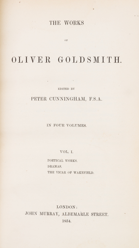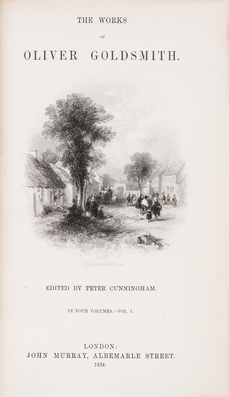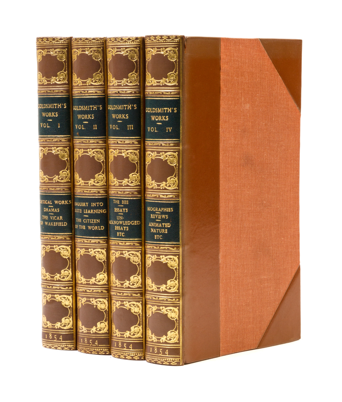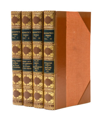 The Works of Oliver Goldsmith. London: John Murray, 1854.4 vols. 8vo, bound by Bayntun in 3/4 tan calf over cloth, gilt-decorated and -lettered spines, green morocco spine labels, t.e.g. Additional engraved title page in each volume, frontispiece in vol. 4. Light edgewear.