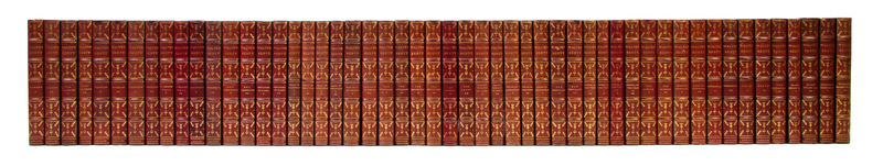 The Complete Works. London: Merrill & Baker, n.d. [c. 1900]52 vols. 8vo, 3/4 brown calf over marbled boards, gilt-lettered and decorated spines, the initials "CCP" stamped in gilt to upper boards. Grand De Luxe edition, number 11 of 500 copies made to order for advance subscribers only, this copy executed for C.C. Parsons with his initials in gilt to boards. Uniform fading to spines; minor edgewear.