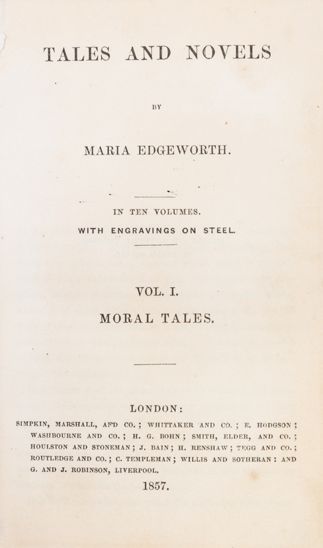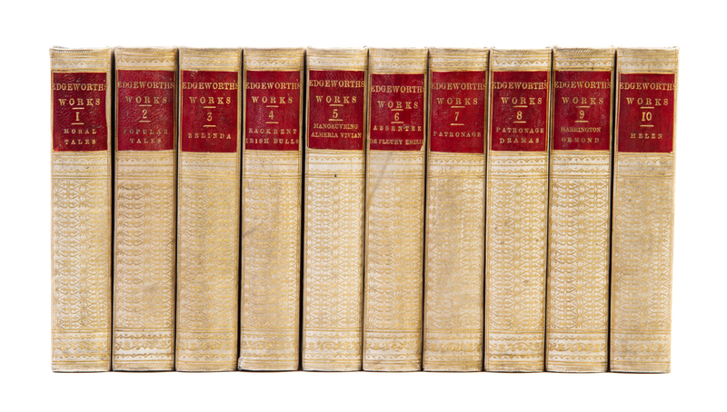 Tales and Novels. London: Simpkin, Marshall, et al., 1857.10 vols. Small 8vo, 3/4 vellum over marbled boards, gilt-decorated and -lettered spines, red morocco spine labels, engraved frontispieces. Rubbing and light soiling to boards; light intermittent foxing.