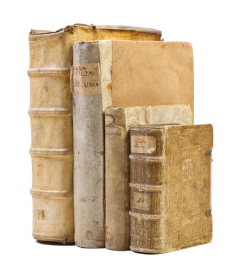 A group of four vellum bound books, comprising Cronologia del mondo. By M. Francesco Sansouino. Venice: Stamperia della Luna, 1580. 8vo, original limp vellum. Biblia Sacra vulgatae editionis. Venice: Typographia Balleoniana, 1769. Folio, quarter vellum. Biblia sacra veteris et novi testamenti... Geneva: Petrum Santandreanum, 1583. Small 8vo, original blind-stamped vellum, metal clasps. Pauli Jouij XLV Bucher. Basel: Petri, 1560. Folio, original blind-stamped vellum.