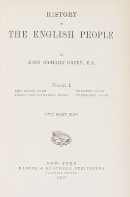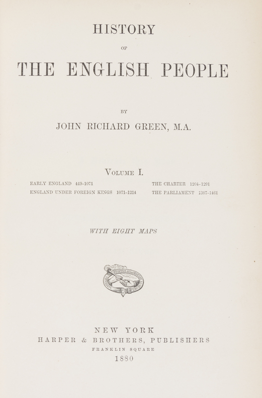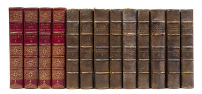 A group of 13 leather-bound books in two sets. Comprising La Comedie humaine. By Honore de Balzac. Philadelphia: George Barrie & Son, 1897. 9 (of 10) vols. only. 8vo, full green crushed morocco, gilt-lettered spines. Illustrated. Light wear and soiling to boards; dampstaining affecting endpapers of vol. 7; ends chipped on some vols.; bookplate tipped to front pastedown.[Together with:] History of the English People. By John Richard Green. New York: Harper & Brothers, 1880. 4 vols. 8vo, 3/4 red morocco over marbled boards, gilt-tooled and lettered spines, t.e.g. Light rubbing to boards; bookplate tipped to front pastedown.