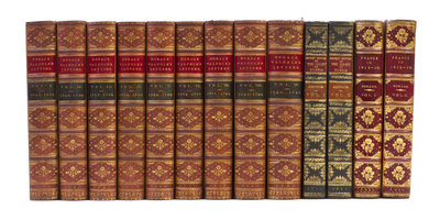 A group of 13 volumes in leather bindings with gilt-tooled spines.The Letters of Horace Walpole, Earl of Orford. Edited by Peter Cunningham. London: Bickers & Son, 1880. 9 vols. 8vo, gilt-tooled and -lettered spines, t.e.g. France in 1829-30. By Lady Morgan. London: Saunders and Otley, 1830. 2 vols. 8vo, 3/4 red morocco over marbled boards, gilt-tooled and -lettered spines, t.e.g. Secret History of the Court and Government of Russi Under Alexander the First and The Emperor Nicholas. By J.H. Schnitzler. London: Richard Bentley, 1854. 2 vols. 8vo, 3/4 blue calf over marbled boards, gilt-tooled and -lettered spines, t.e.g.