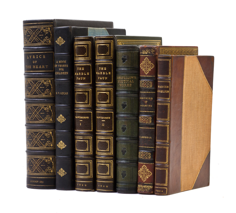 A group of seven volumes bound in shades of blue and green leather.Comprising The Marble Faun: or, The Romance of Monte Beni. By Nathaniel Hawthorne. Boston: Ticknor and Fields, 1860. 2 vols. 8vo, gilt-stamped green morocco, gilt-lettered spine, t.e.g. Lyrics of the Heart: with Other Poems. By Alaric A. Watts. London: Longman, Brown, Green, and Longmans, 1851. 8vo, gilt-stamped navy morocco, gilt-tooled and -lettered spine, a.e.g. With 41 steel-engravings. A Book of Verses for Children. By Edward Verrall Lucas. London: Chatto & Windus, 1919. 8vo, 3/4 navy calf over cloth, gilt-lettered spine, t.e.g. The Poetical Works. By H.W. Longfellow. London: T. Nelson, 1861. 8vo, gilt- and blind-stamped green-blue calf, gilt-lettered spine, a.e.g. Illustrated. Gertrude of Wyoming, and Other Poems. By Thomas Campbell. London: Longman, Hurst, Rees, Orme, and Brown, 1816. 8vo, full diced calf, gilt-lettered spine. Illustrated. Marcus Aurelius Antoninus to Himself. London: Macmillan, 1920. 8vo, 3/4 calf over cloth, gilt-lettered spine, a.e.g.