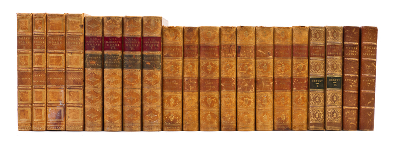 A collection of 20 leather-bound books in five sets, comprising Paley's Works, (1825), vols. II, III, IV and VI (of 7), Mrs. Jameson's Works, (1896), vols. I-IV (of 5), Holmes's Works, (1889-1890), 8 vols., Court of George II, (1848), 2 vols., and Hours in a Library, (1894), vols. II and III (of 3).