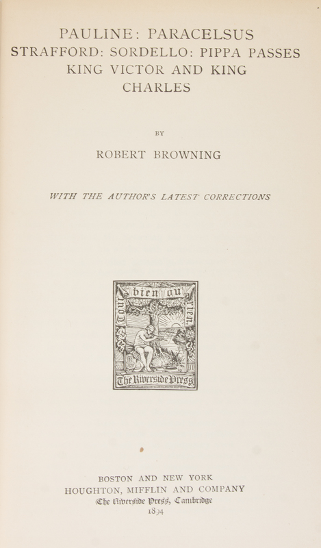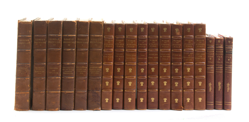 A group of 18 leather-bound books, comprising The Works of Edgar Allen Poe. New York: Thomas Nelson & Sons, (1905). 3 vols. Small 8vo, 3/4 red morocco over cloth. The Poetic and Dramatic Works of Robert Browning. Boston: Houghton, Mifflin and Company, 1894-1895. 6 vols. 8vo, 3/4 brown morocco over marbled boards, gilt-lettered spines. The Writings in Prose and Verse of Eugene Field. New York: Charles Scribner's Sons, 1904-1905. 9 vols. 8vo, 3/4 brown morocco over marbled boards, gilt-lettered spines. (18 total)Rubbing to boards; boards detached from some vols.; intermittent light foxing to most vols.