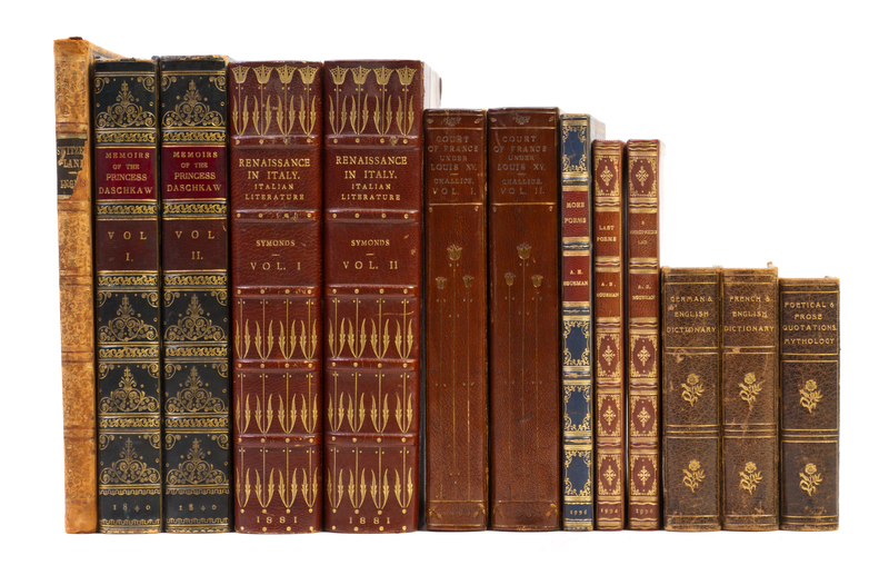 A group of 15 leather-bound books, some finely bound.Renaissance in Italy. Italian Literature. By John Addington Symonds. London: Smith, Elder, 1881. 2 vols. Bound by Riviere & Son. Memoirs of the Princess Daschkaw... By Mrs. W. Bradford. London: Henry Colburn, 1840. 2 vols. Bound by Zaehnsdorf. The Secret History of the Court of France Under Louis XV. By Dr. Challice. London: Hurst and Blackett, 1861. 2 vols. More Poems. By A.E. Housman. London: Jonathan Cape, (1936). Bound by Zaehnsdorf. A Shropshire Lad. By A.E. Housman. London: Richards Press, 1936. Bound by Zaehnsdorf. Last Poems. By A.E. Housman. London: Richards Press, 1934. Bound by Zaehnsdorf. Reference Library. New York: Brentano's, n.d. 5 vols. uniformly bound. Switzerland, the South of France, and the Pyrenees. By H.D. Inglis. London: Whittaker, 1840.