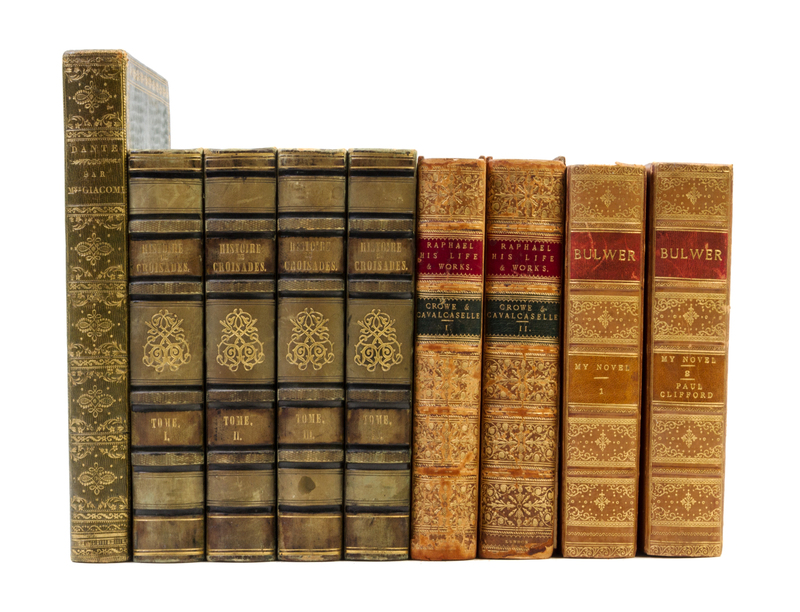 A group of nine leather-bound books, comprising My Novel. By Edward Bulwer Lytton. Boston: Dana Estes, n.d. [c. 1852] 2 vols. 8vo, 3/4 tan calf over marbled boards, gilt-tooled and -lettered spines, t.e.g. Raphael: His Life and Works. By J.A. Crowe. London: John Murray, 1882. 2 vols. 8vo, full tree calf, gilt-tooled and lettered spine, red leather spine labels. Histoire des croisades. By Michaud. Paris: Furne, 1849. 4 vols. 8vo, quarter green morocco over mottled boards, gilt-lettered and decorated spines. La divina comedia. By Dante Alighieri. Paris: Salmon, n.d. 4to, full diced green leather, gilt-tooled and -lettered spine.