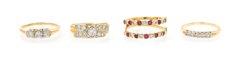 consisting of a 14 karat gold ring containing one round brilliant cut diamond weighing approximately 0.25 carat and 10 round single cut diamonds weighing approximately 0.25 carat total, a 14 karat gold ring containing three round brilliant cut diamonds weighing approximately 0.50 carat total, a 14 karat gold ring containing six round single cut diamonds weighing approximately 0.12 carat total and a gold ring containing 13 round cut rubies and 13 round brilliant cut diamonds. Stamp: 14K.