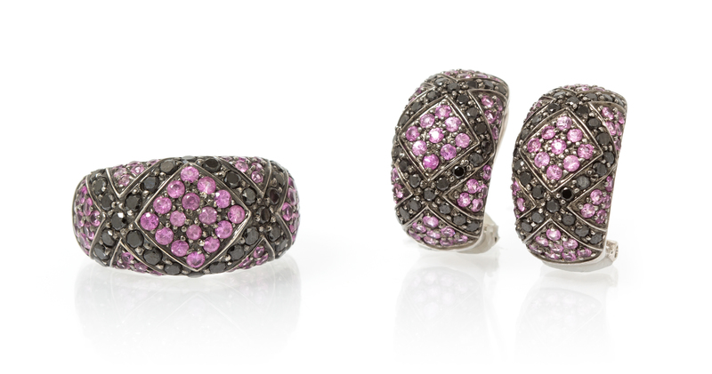 consisting of a ring containing 28 round brilliant cut black diamonds weighing approximately 0.84 carat total and numerous round mixed cut pink sapphires, together with a pair of earclips containing 56 round brilliant cut black diamonds weighing approximately 0.56 carat total and numerous round mixed cut pink sapphires.Stamp: 18K 750 A.