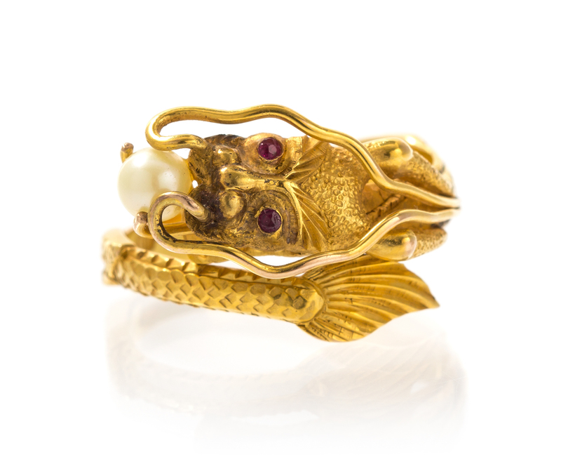 in a stylized dragon motif containing one pearl measuring approximately 4.51 mm in diameter and two round cut rubies. Stamp: K18.
