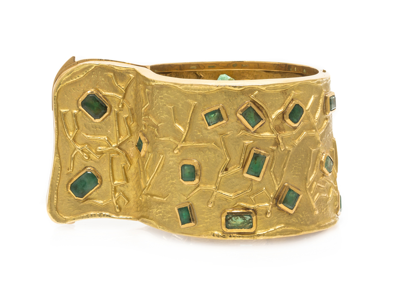 the hinged oval form cuff elongated to one side, the intricately textured surface depicting numerous raised stylized humanoid stick figures of polished finish against the hammered texture matte finish background interspersed with 29 bezel set step cut emeralds, eccentric double latch closure opens to reveal complex openwork under gallery.Accompanied by original fitted case.