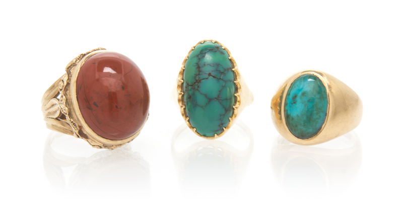 consisting of a nine karat gold ring containing an oval cabochon cut jasper measuring 12.80 x 18.74 mm, a 14 karat gold ring containing one oval cabochon cut turquoise measuring approximately 12.80 x 18.74 mm and an 18 karat gold ring containing one oval cabochon cut turquoise measuring approximately 15.72 x 10.53 mm.