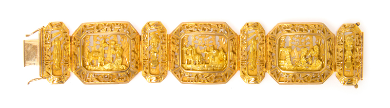 measuring approximately 1 5/8 inches in width, consisting of seven open work links depicting Mesoamerican scenes. Stamp: Reg.Inc. 0892 18K.