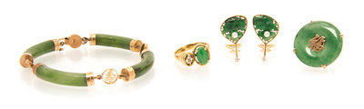 consisting of a yellow gold ring containing one oval cabochon cut jade and four round brilliant cut diamonds weighing approximately 0.04 carat total, an 18 karat gold bracelet with four carved pieces of nephrite jade and Chinese characters, a pendant with a jade hololith and Chinese character in the center and a pair of earrings containing two pieces of carved jade, two pearls measuring approximately 3.50 mm in diameter and two round brilliant cut diamonds weighing approximately 0.10 carat total.