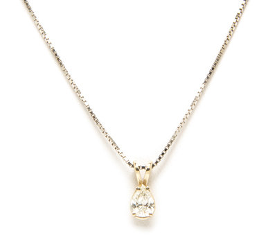 containing one pear shape brilliant cut diamond weighing approximately 0.49 carat suspended from a box link chain.Stamp: 14K ITALY.