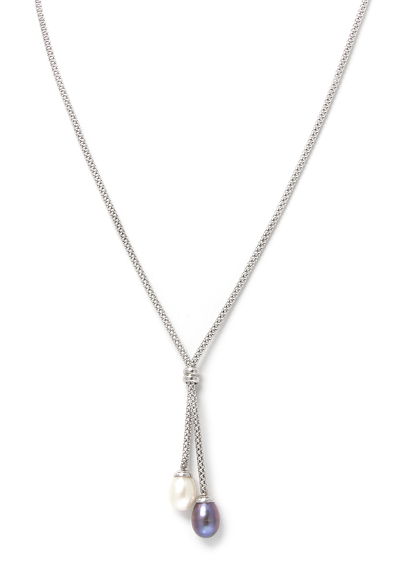 in a lariat style with a popcorn chain, accented with one cream colored baroque pearl and one purple baroque pearl. Stamp: 14K.
