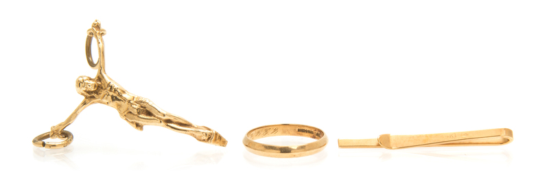 consisting of a tie bar containing one round single cut diamond weighing approximately 0.02 carat, a band ring and a crucifix pendant.Stamp: 14K.