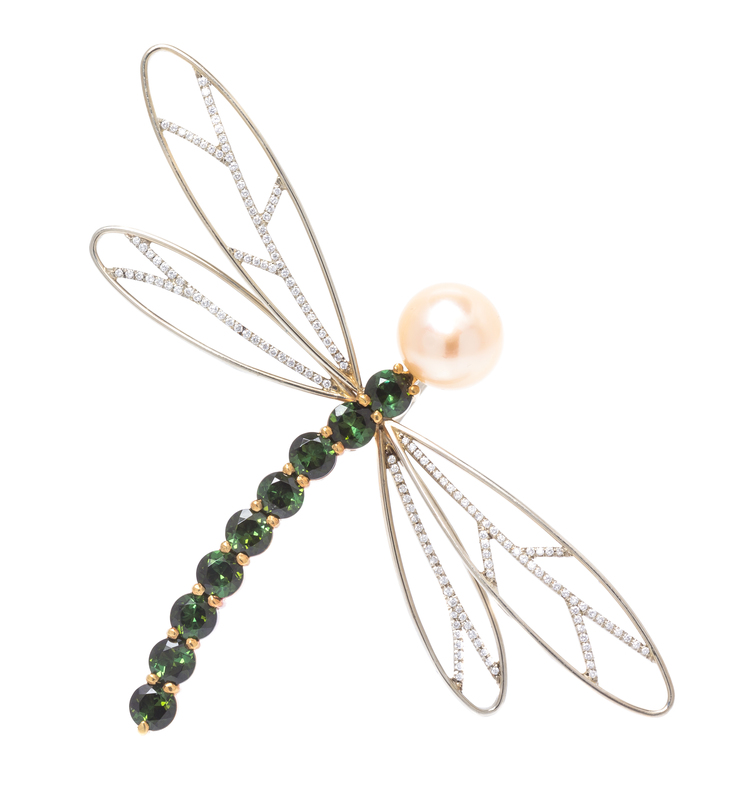 An 18 Karat Gold, Tourmaline, Cultured Pearl and Diamond Dragonfly Brooch, Gregore,
