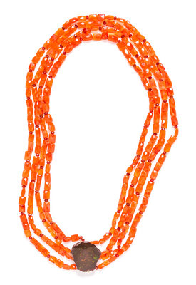 consisting of a central pendant containing a polished freeform chocolate opal plaque measuring approximately 40.00 x 37.50 mm, the pendant is suspended from a four strand necklace composed of numerous faceted carnelian beads, pendant can be detached and worn as a brooch.Stamp: 14K (maker's mark).