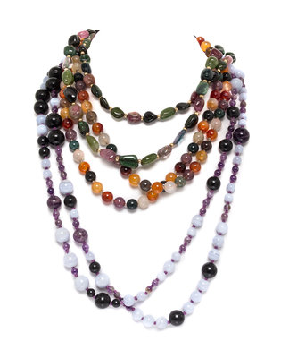 consisting of one 34 inch strand of tumbled tourmaline beads, each bead of various hues including pink, green and blue, the beads separated by yellow gold beads, one 34 inch strand of agate and moss agate necklace beads measuring approximately 8.17 mm in diameter, and one 47 inch strand of amethyst beads, banded agate beads and black onyx beads.