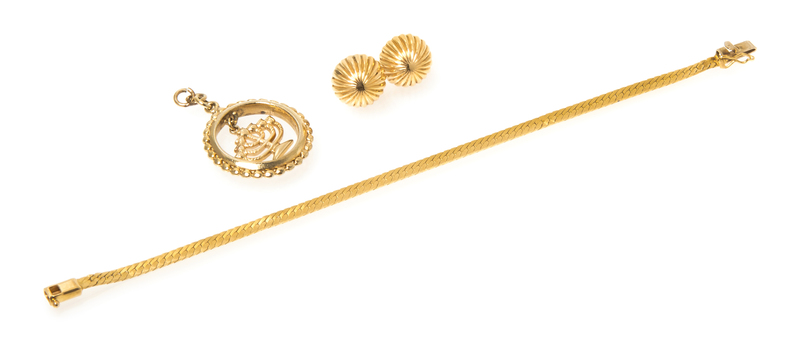 consisting of a pair of 14 karat gold textured dome stud earrings, a 14 karat gold herringbone bracelet and a gold tone menorah charm.Bracelet stamp: 14KT ITALY.Earrings stamp: 1051 14K.