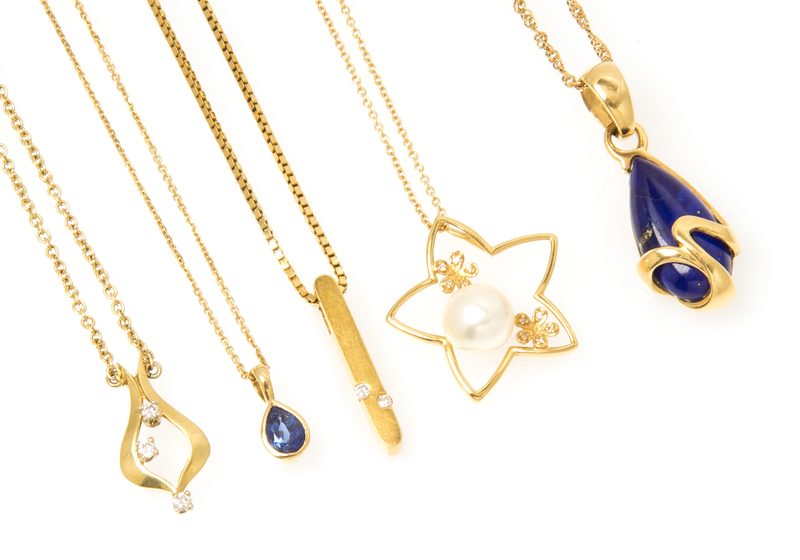 A Collection of 18 Karat Yellow Gold, Cultured Pearl, Diamond and Gemstone Pendant Necklaces,