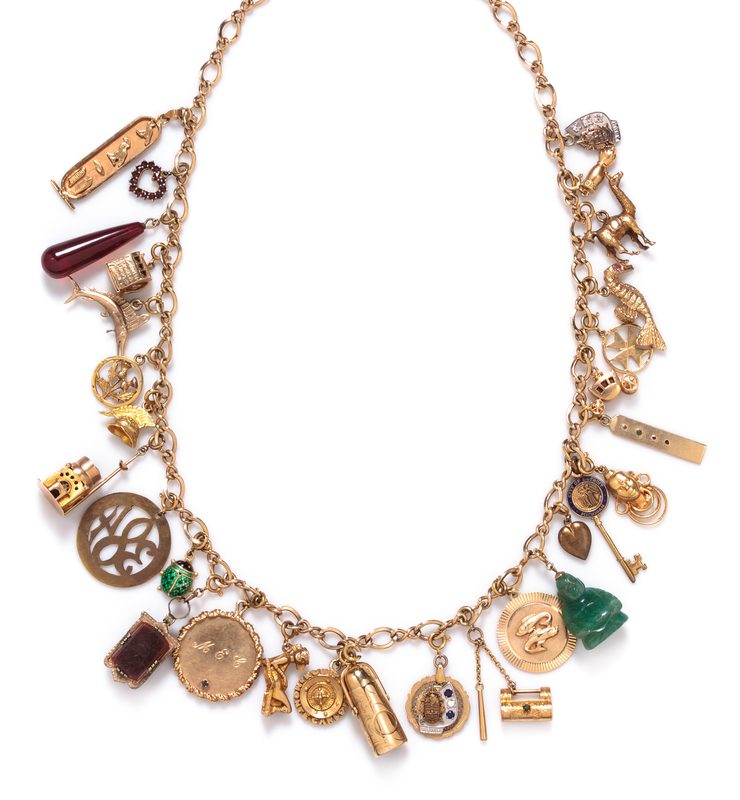 including an 18 karat yellow gold Egyptian cartouche pendant charm, a goldtone garnet heart charm, an oblong plastic bead charm, a 14 karat yellow gold articulated slot machine charm, a 14 karat yellow gold sword fish charm, an 8 karat yellow gold thistle charm, an ancient Roman helmet charm, a 14 karat yellow gold building charm, a gold tone 384 charm, a 14 karat yellow gold and polychrome enamel ladybug charm, an antique gold tone and agate locket charm, a 14 karat yellow gold and sapphire disc charm, a goldtone charm of a reclining figure, a 14 karat yellow gold cigarette cutter charm, a goldtone articulate roulette wheel charm, a 12 karat gold filled, sapphire and diamond gold filled charm, a 14 karat yellow gold, ruby and emerald barrel lock and key charm, a 14 karat yellow gold Pisces charm, a carved hardstone Buddha, a goldtone heart charm, a goldtone African motif charm, a goldtone and blue enamel key to Detroit charm, a diamond, emerald, ruby and sapphire charm, an articulated carriage charm, an 18 karat yellow gold Maltese cross charm, a yellow gold and seahorse charm, a goldtone llama charm, a yellow gold figa charm and a 10 karat yellow, white gold and diamond family crest charm.