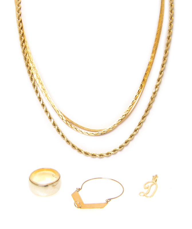 consisting of a 14 karat gold half circular pendant attachment with "V" shape on bottom for drop attachment, a 14 karat gold twisted rope chain, a 14 karat gold flat chain, a 14 karat gold two-tone band with striations in center, and a letter "D" pendant.