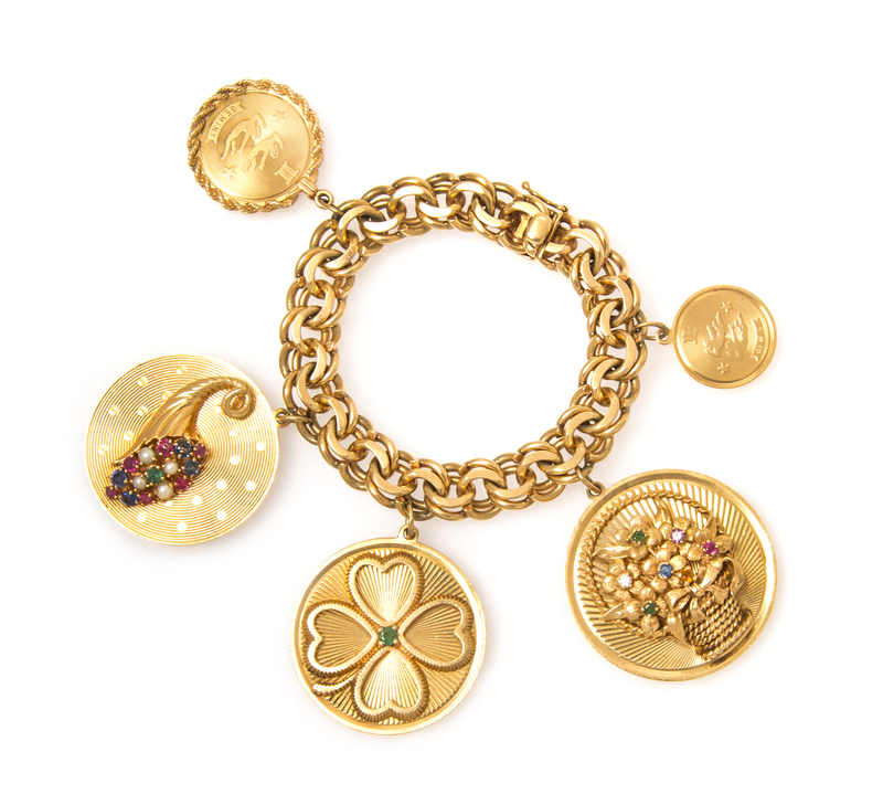 including a 14 karat gold Gemini charm with rope border, a 14 karat gold cornucopia charm containing pearls, rubies, sapphires and an emerald, a 14 karat four leaf clover containing one round cut emerald, a 14 karat flower basket charm containing multi gems and 14 karat Gemini charm. Stamp: 14K.
