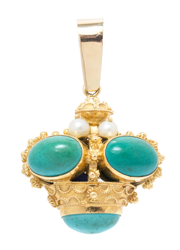 A Yellow Gold, Turquoise and Cultured Pearl Pendant,