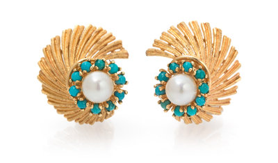 A Pair of 14 Karat Yellow Gold, Cultured Pearl and Turquoise Earclips,