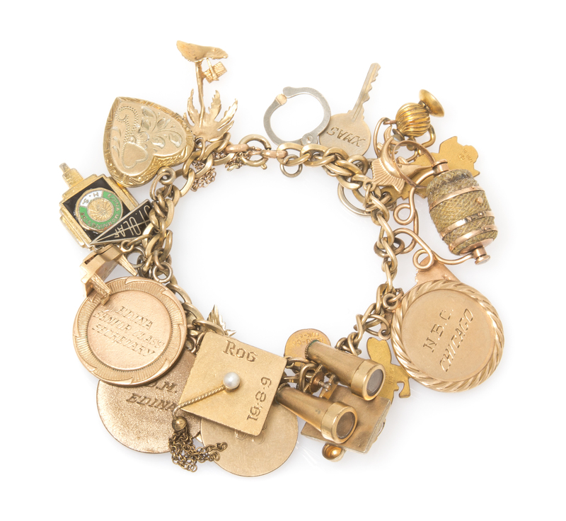 consisting of a 14 karat gold Florida palm tree charm, a gold over sterling heart locket charm, a St. Olaf pennant charm, a 14 karat piano charm, a 12 karat gold-filled Edina Senior Class Secretary disc charm, an enameled Edina Morningside H.S. crest charm, a sterling leaf charm, a 12 karat gold-filled Most Talented disc charm, a gold-tone Treble Clef charm, a 12 karat gold-filled Powers Knollwood disc charm, a gold-tone disc charm, a gold-tone rotary telephone charm, a 10 karat gold-filled Circulo Espanol crest charm, a 12 karat gold-filled graduation cap charm, a 10 karat bee charm, a gold-tone binoculars charm, a 14 karat United Nations charm, a 12 karat gold-filled N.B.C. Chicago disc charm, a gold-tone and twine barrel charm, a 10 karat gold-filled Edina Morningside H.S. charm, a gold swordfish charm, a 12 karat gold-filled key charm, a pair of handcuff charms and a 12 karat gold-filled teapot charm with pearl lid.