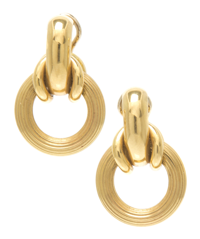 in a door-knocker style, with a high polished center attached to dangling satin finish loops.Stamp: 18K MADE IN ITALY.