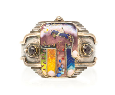 A Sterling Silver, Yellow Gold, Polychrome Cloisonne Enamel and Garnet Cuff Bracelet, Colette Denton, Circa 1979,