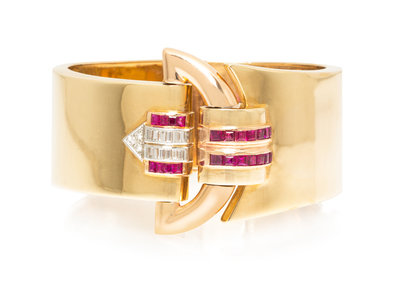 in a gold hinged buckle design with platinum accents, containing 22 calibre cut rubies weighing approximately 2.00 carats total, three round single cut diamonds weighing approximately 0.06 carat total and 12 baguette cut diamonds weighing approximately 0.48 carat total.