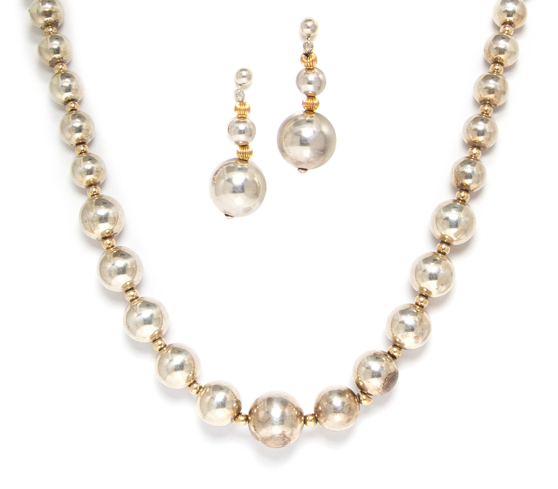 consisting of a necklace comprised of alternating silver and gold tone beads, and a pair of earrings consisting of alternating silver and yellow gold beads. Stamp: 925.