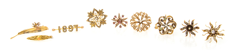 consisting of one starburst pendant/brooch with seed pearls round pink stones, one 10 gold karat starburst brooch with seed pearls, one 14 gold karat starburst pendant/brooch in with seed pearls and one old European cut diamond, one starburst brooch with seed pearls containing one old mine cut diamond, one floral brooch with seed pearls and a round paste stone, one 14 karat gold brooch with seed pearls and blue, white and yellow enamel in a floral motif, one 14 karat gold Art Nouveau enamel bar brooch, one 9 karat gold and seed pearl "1897" bar brooch and one 18 karat gold leaf brooch with attached bird and flower, containing one old mine cut diamond.