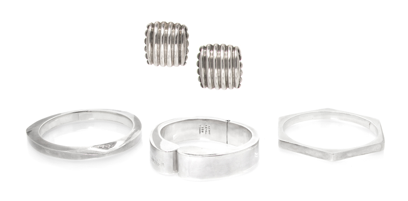consisting of a Mexican silver hinged cuff bracelet by Dulce, a sterling silver hexagonal shape bangle, a sterling silver trigonal shaped bangle, together with a pair of sterling silver ribbed earclips.Hinged bangle stamp: 950 MEXICO TD 34.Bangle stamp: 925 TS-32 Mexico.Bangle stamp: 925 MM 34 Mexico.