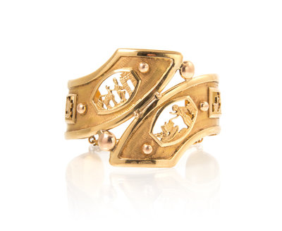 in a bypass design containing figural alpaca and boat motifs.Stamp: MADE IN PERU 18K.