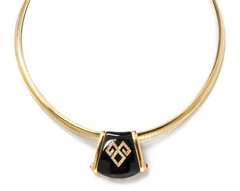 A Yellow Gold, Onyx, Diamond and Ruby Slide Pendant Necklace,