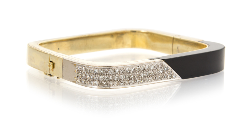 A 14 Karat Yellow Gold, Onyx and Diamond Bangle Bracelet,