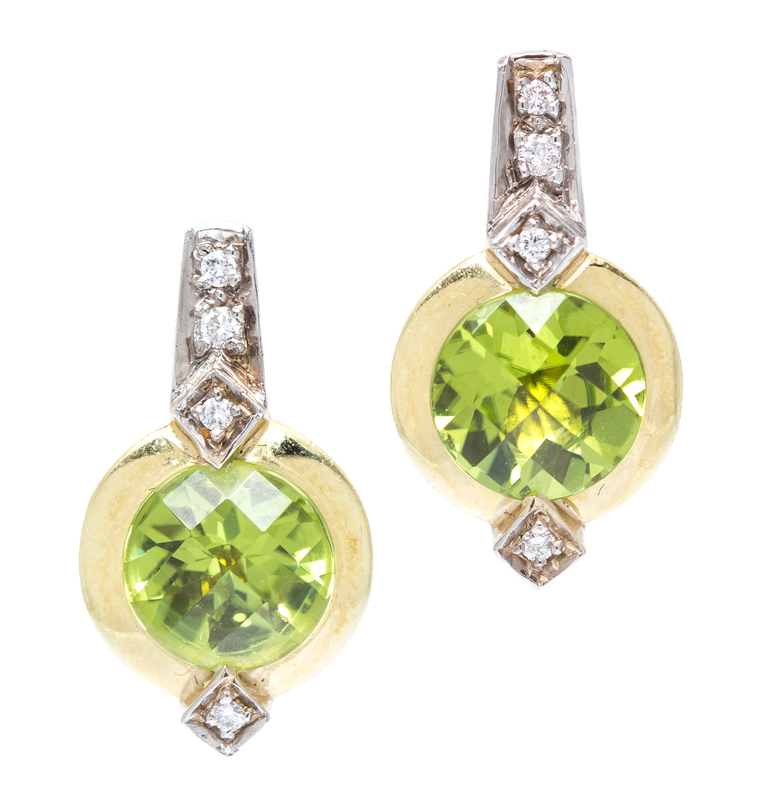 A Pair of 18 Karat Gold, Peridot and Diamond Earrings,