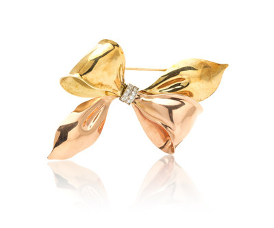 composed of rose and yellow gold sections in a realistic ribbon motif gathered with a central knot containing eight round single cut diamonds weighing approximately 0.16 carat total, bow measures approximately 80.00 x 60.00 mm.Stamp: (acorn hallmark).
