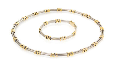 consisting of a matching collar necklace and bracelet containing white gold satin finish links and polished yellow gold "X" shaped links. Stamp: 18K.