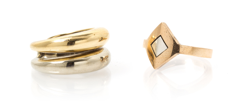 consisting of a yellow gold ring with an inlaid white gold diamond shape design and a double domed yellow and white gold ring.Stamp: 14K.