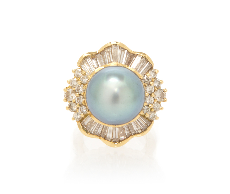 A 14 Karat Yellow Gold, Tahitian Pearl and Diamond Ring,