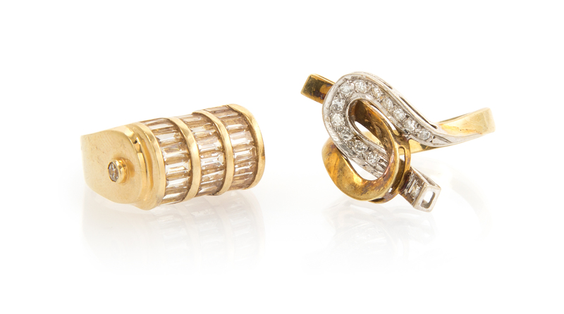 consisting of a ring containing 13 round brilliant cut diamonds weighing approximately 0.15 carat total and barrel shaped ring containing synthetic baguette and round brilliant cut diamonds.Stamp: 14K.